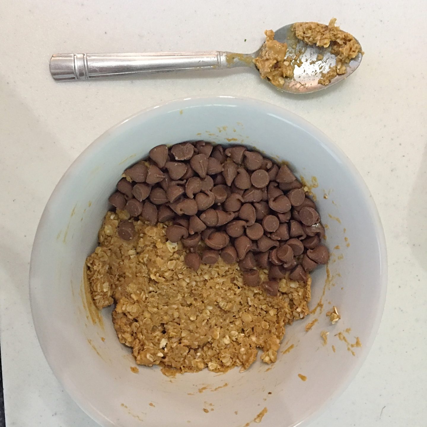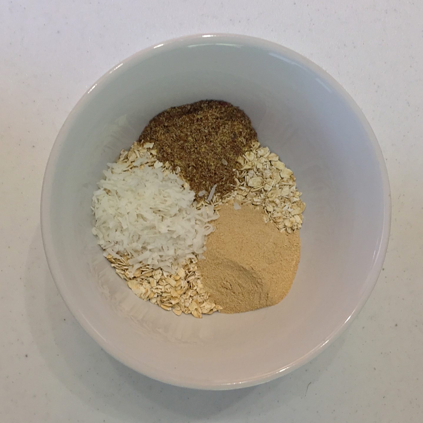 Mix all dry ingredients, except for chocolate chips (oats, flax seed, brewer’s yeast).