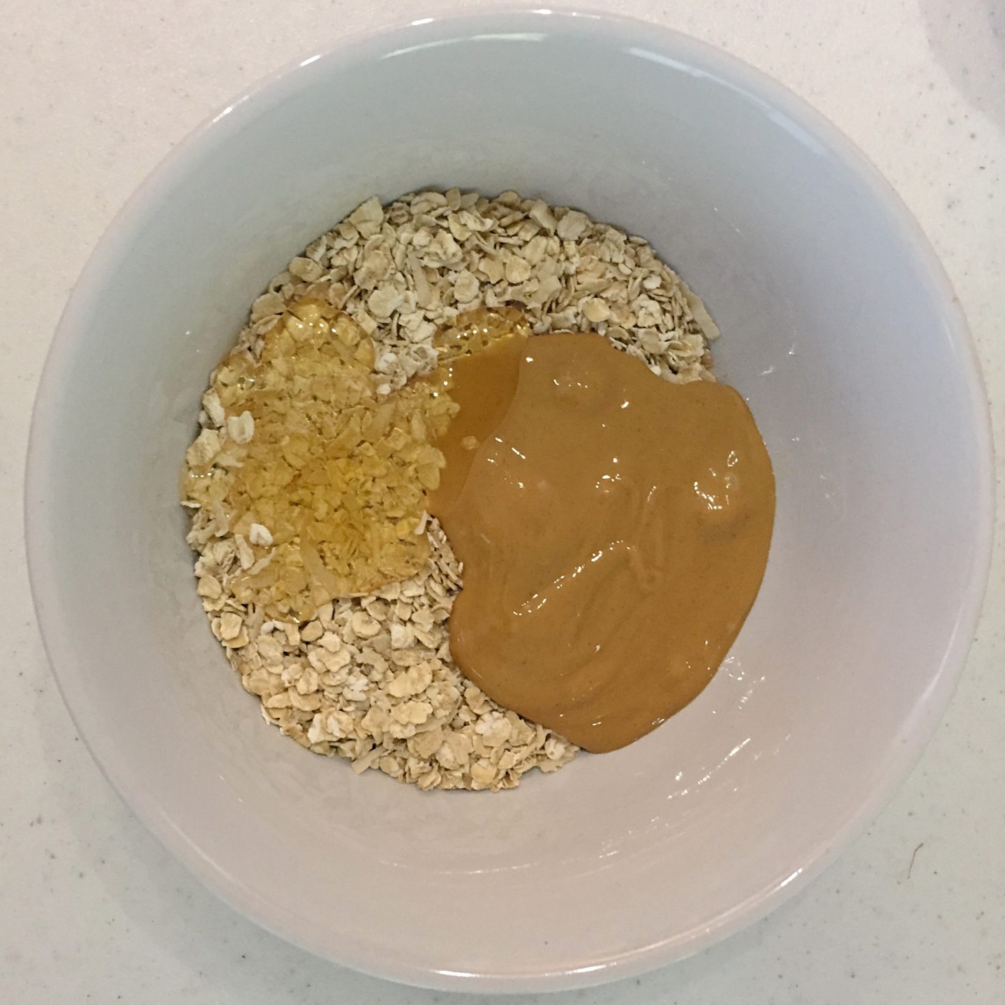 Add in peanut butter and honey. Mix with a spoon or your hands.
